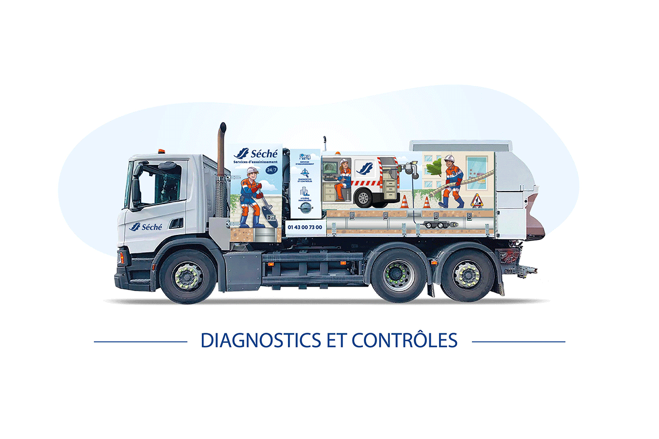 Séché assainissement Communication mobile pour la nouvelle activité assainissement de Séché environnement. Les véhicules adoptent un style graphique unique à la fois pédagogique et illustratif des différents métiers. Diagnostic et contrôle, assainissement, hygiène immobilière: des camions et véhicules Séché qui ne passent pas inaperçus.